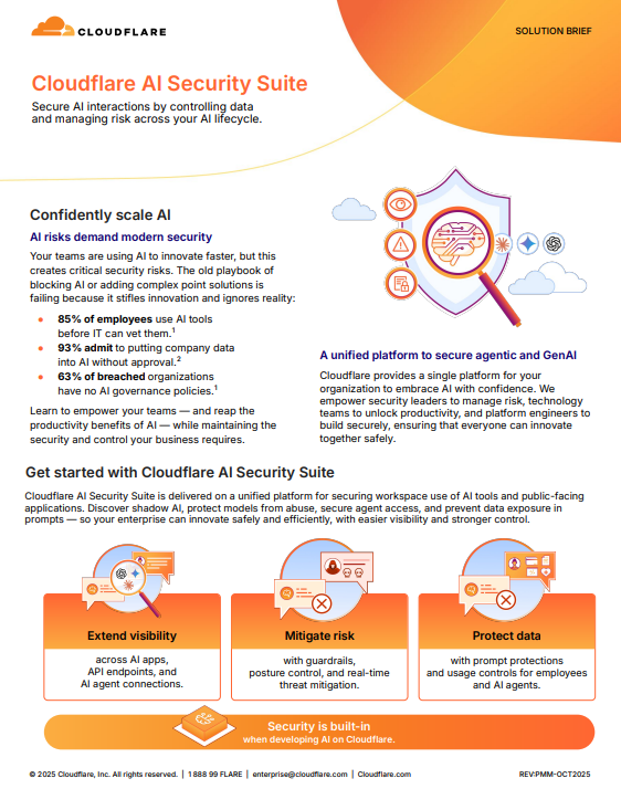 Cloudflare AI Security Suite offers a unified platform for securing workforce AI tools and public-facing applications. Discover shadow AI, protect models from abuse, secure agent access, and prevent data exposure in prompts — so your enterprise can innovate safely and efficiently, with easier visibility and stronger control.